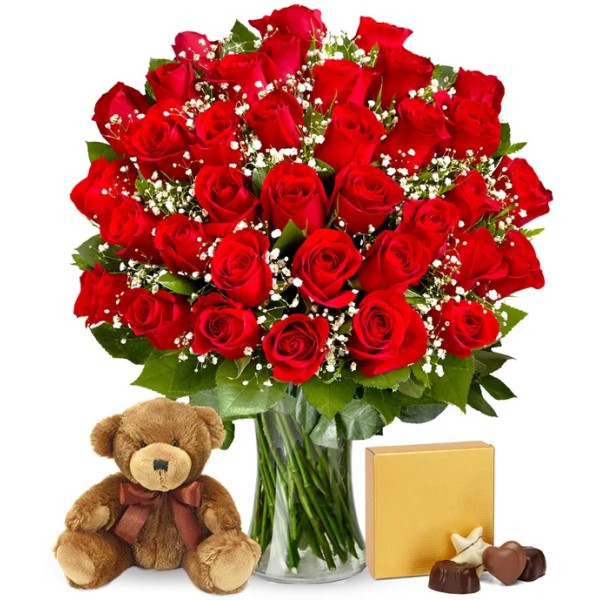 Vazoda 35 Kırmızı Gül Ayıcık ve Çikolata