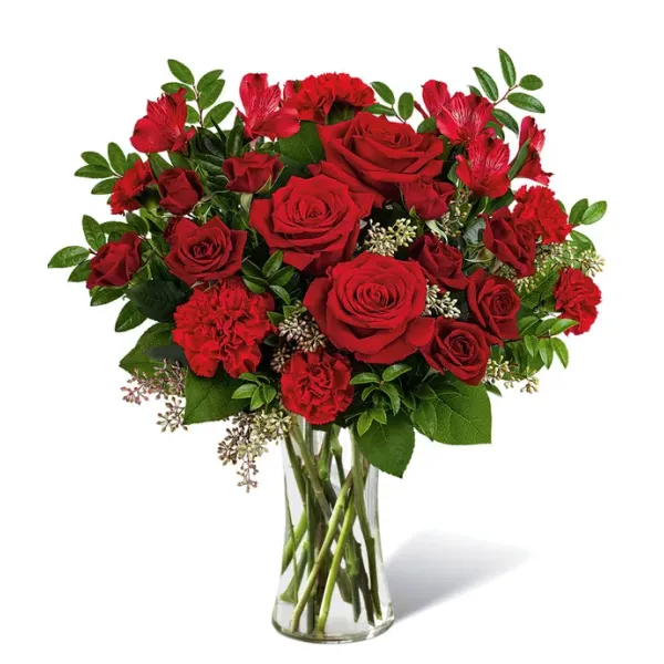 Göz alıcı 11 adet canlı kırmızı gülden oluşan, zarif Monte Casino çiçekleriyle şık bir şekilde düzenlenmiş bu buket, kristal berraklığında bir cam vazoda duyuları büyülüyor. Derin kırmızı tonları aşkı ve tutkuyu simgeleyen bu aranjman, romantizm ve zarafet yayıyor. Muhteşem kırmızı bir kurdeleyle süslenen buket, zamansız bir sevgi ifadesi haline gelerek özel günler veya içten anlar için mükemmel bir hediye seçeneği sunuyor.Özellikler